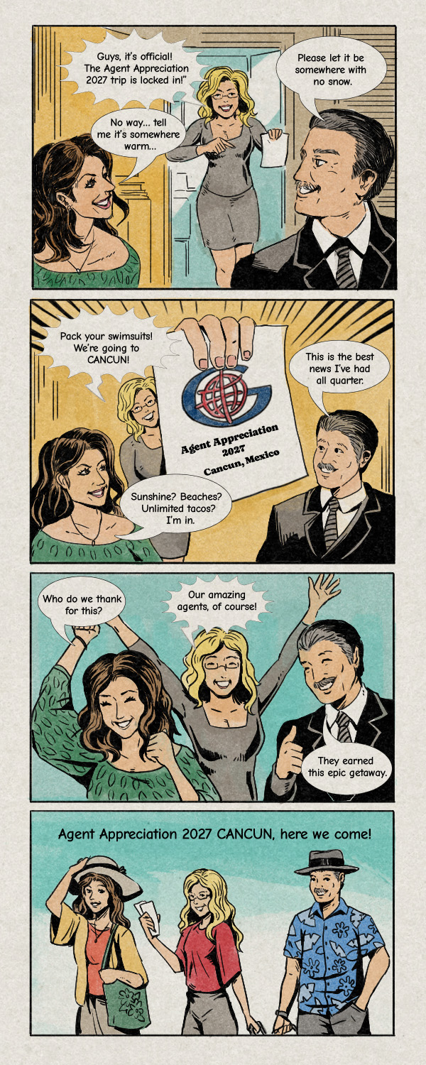 Trip is non-transferable and not redeemable for cash or any other prizes. Attendee is responsible for taxes and will receive a 1099. Should the attendee cancel after having registered, he/she will continue to receive a 1099 for the non-refundable costs incurred. Gordon Marketing requires agents attend all scheduled events meetings, guest attendance is not mandatory at business meeting.
